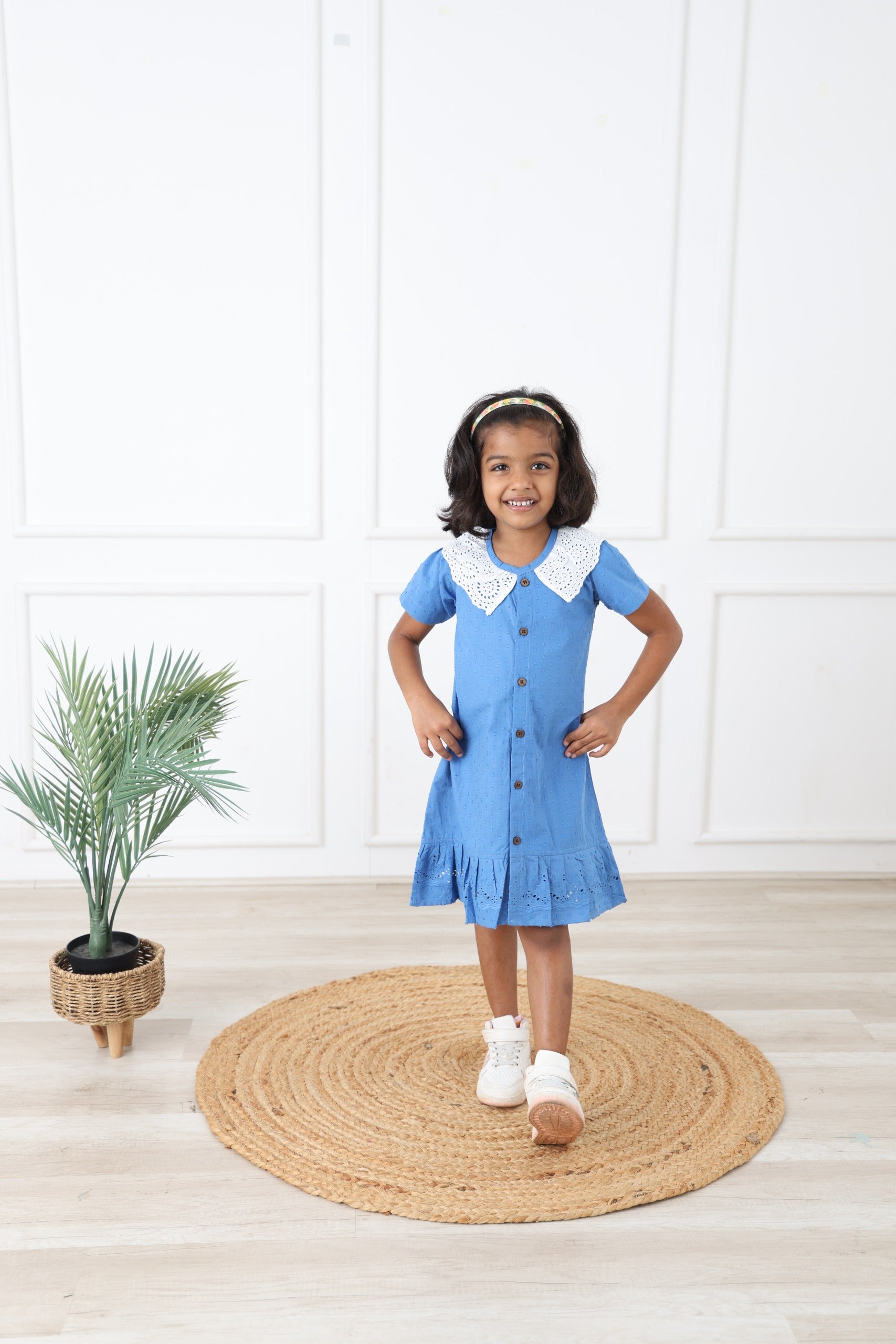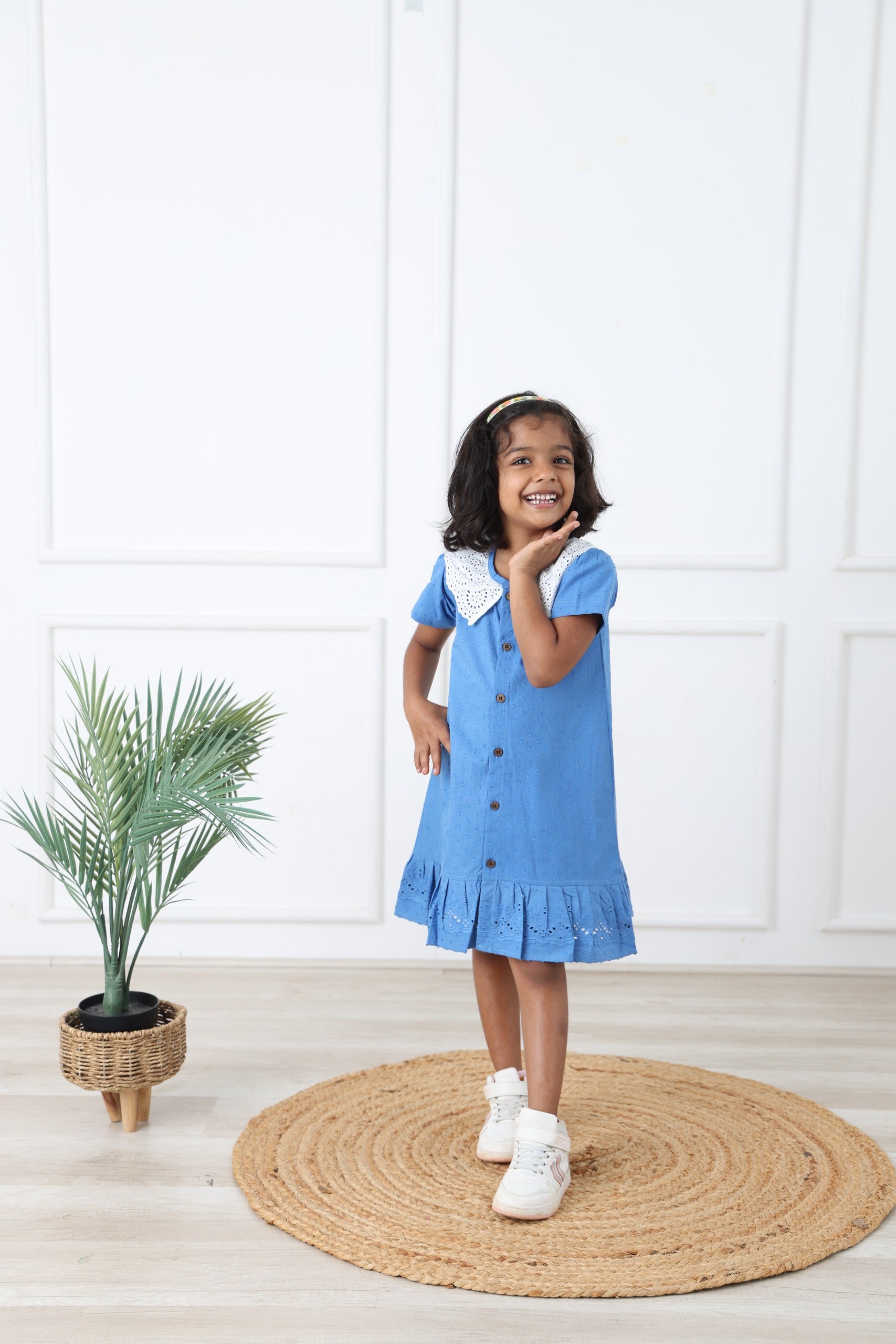 Sweet, stylish, and full of charm, the Blue Bell Charm Frock is perfect for your little one’s everyday adventures. Crafted in a beautiful breezy blue fabric with delicate textured detailing, this frock features a lovely white lace collar that adds a touch of classic elegance. The relaxed silhouette ensures all-day comfort, while the playful frill hem with eyelet accents gives it a cute and twirl-worthy finish. Soft, lightweight, and easy to wear, it’s an ideal choice for playdates, outings, and special little moments. 💙✨