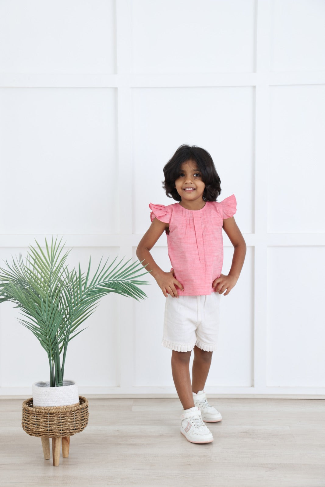Let your little one shine in our adorable *Bubble Bliss Set*, crafted for everyday comfort with a touch of playful charm. The set features a soft pink flutter-sleeve top with delicate pleats, paired with breezy off white shorts accented with cute fringe detail at the hem. Finished with a lightweight, airy design, this outfit is perfect for play dates, outings, or just a day of fun at home. Stylish yet comfy, it’s a must-have for your kid’s casual wardrobe..