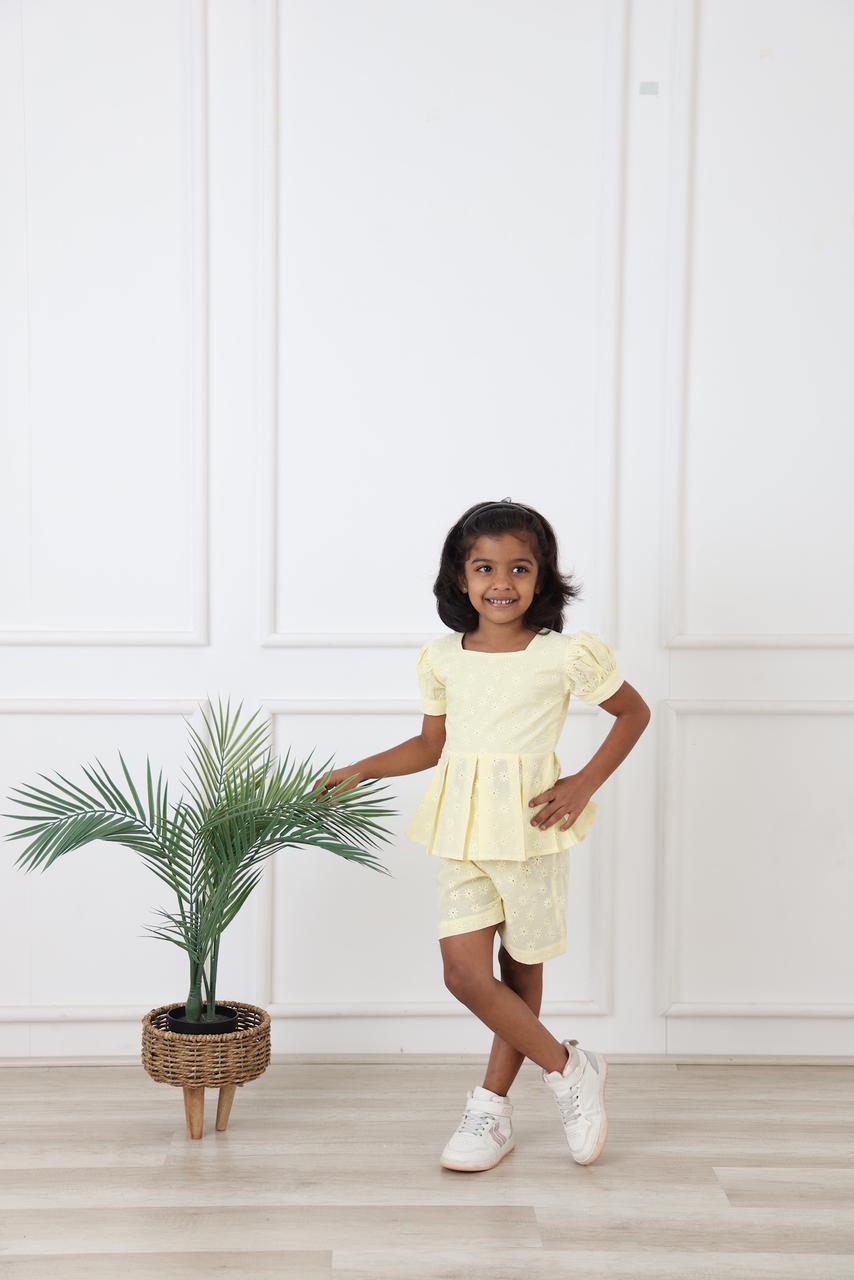 Soft as sunshine and sweet as a summer morning, the Butter Bloom Co-ord Set is crafted in a gentle butter-yellow hue with delicate all-over floral embroidery. The puff-sleeve top features a relaxed, flared silhouette that flows beautifully, paired with matching bottoms for an effortlessly coordinated look. Lightweight and breathable, this set is perfect for sunny outings, playdates, and special daytime moments. Designed to keep your little one comfortable while looking charmingly elegant all day long.