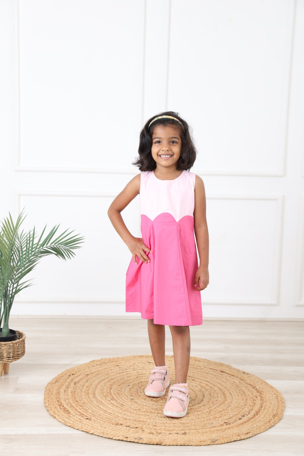Soft as a sweet daydream, the Candy Cloud Frock is a delightful blend of playful charm and simple elegance. Designed in a beautiful two-tone palette, the frock features a gentle pastel pink bodice that flows into a rich candy-rose skirt with a scalloped waist detail that adds a touch of whimsy.