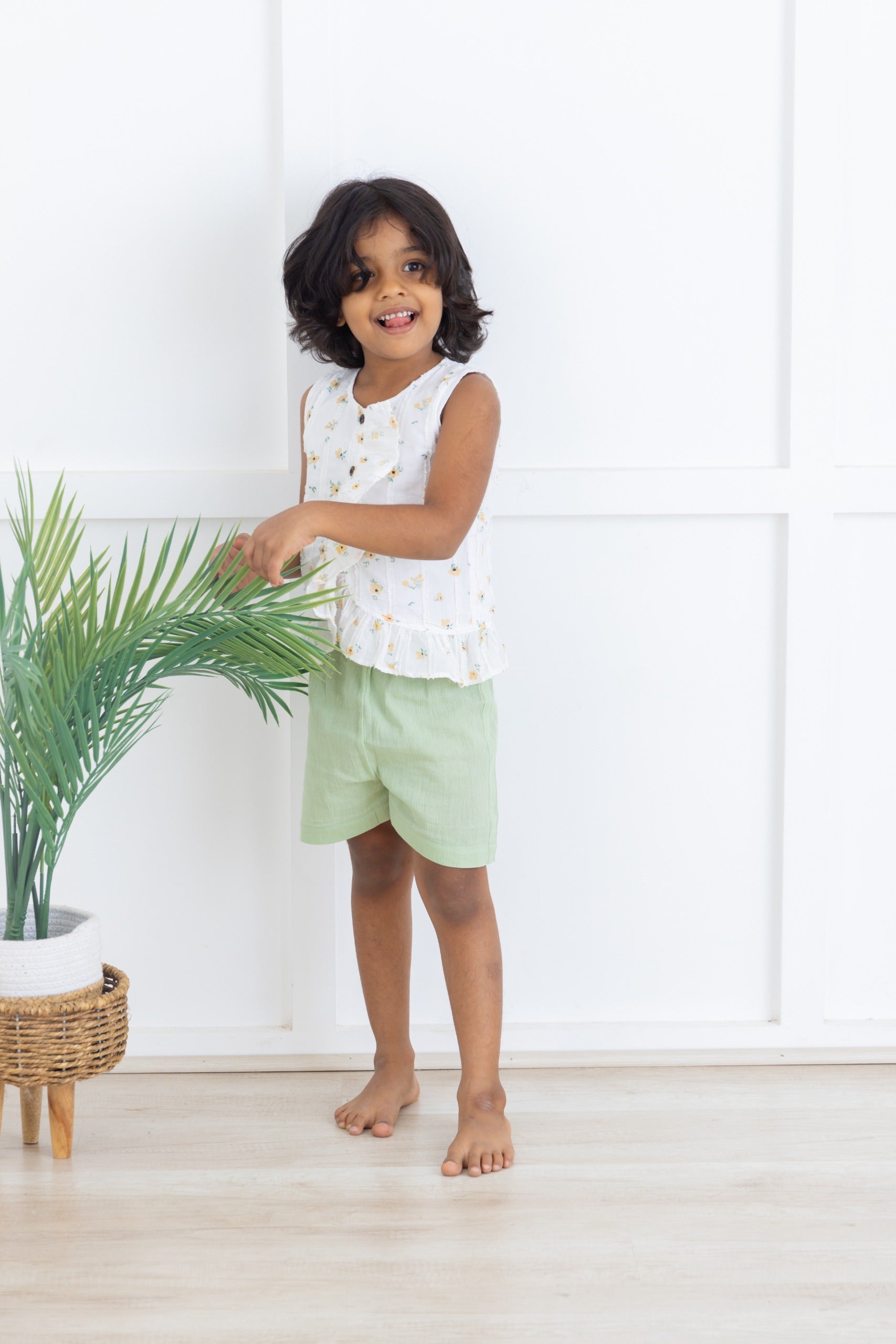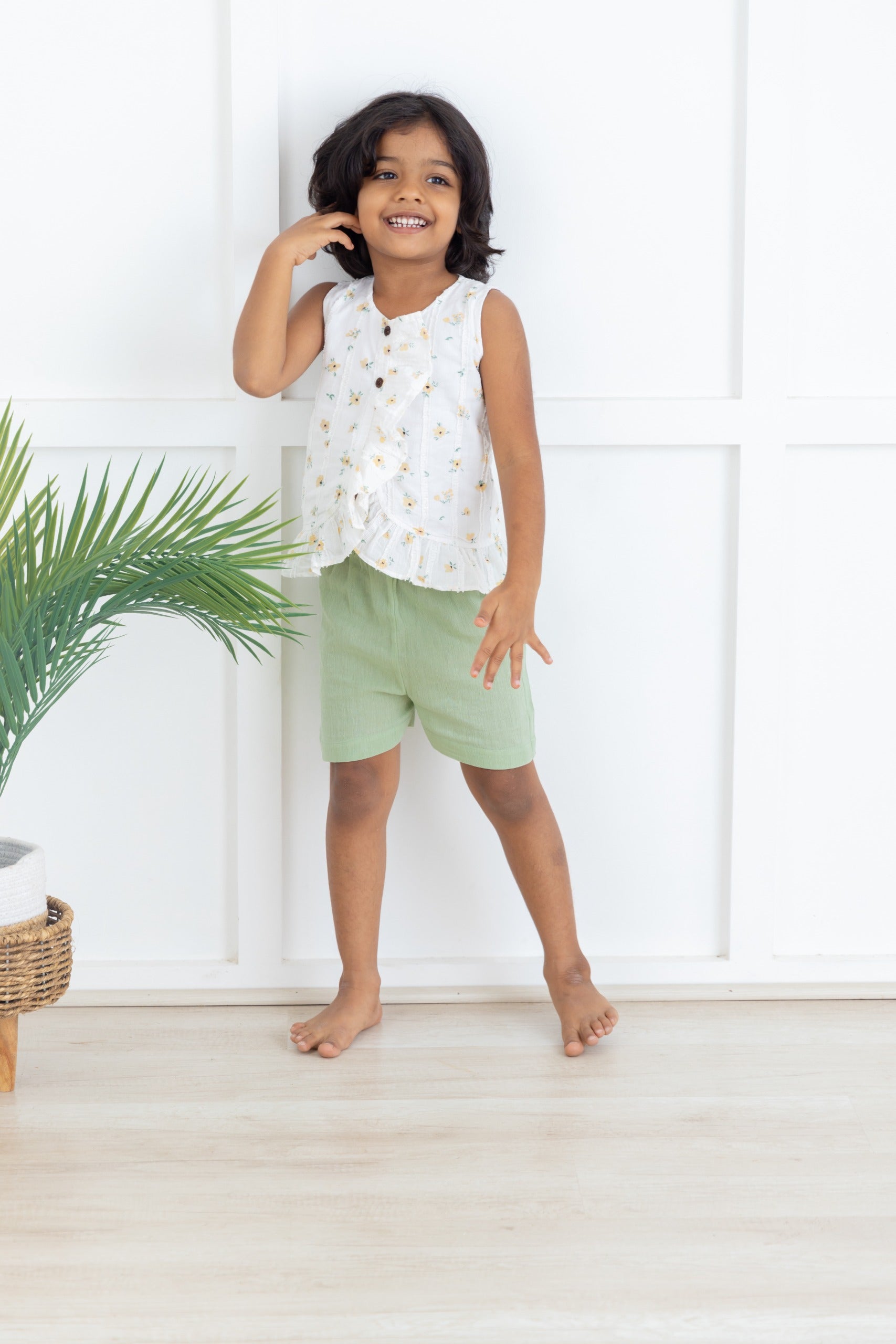 Delicate, airy, and full of charm, the Garden Whisper Set is designed for carefree summer days. The sleeveless peplum top features a soft base adorned with tiny floral motifs, finished with gentle gathers that add a playful flow. Paired with soothing sage-green shorts, this set strikes the perfect balance between comfort and style.