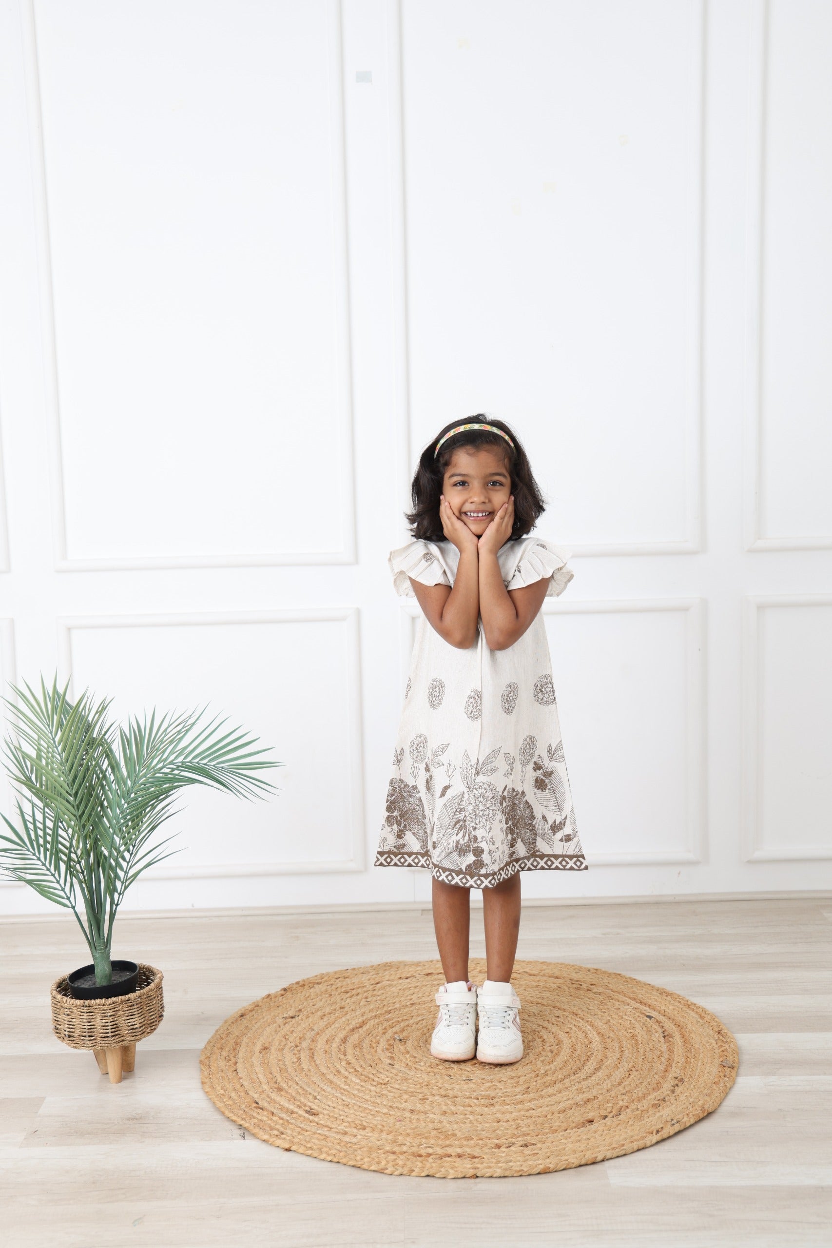 Elegant and effortlessly charming, the Ivory Blossom Frock is designed to bring a touch of nature-inspired beauty to your little one’s wardrobe. Made from soft, breathable fabric in a gentle ivory shade, this frock features delicate floral motifs across the bodice and a beautifully detailed botanical print along the hem. The flutter sleeves and subtle gathers at the neckline create a graceful A-line silhouette that allows easy movement and all-day comfort. Perfect for casual outings, family gatherings, and special moments, this frock blends simplicity with timeless style. 🌿🌼✨