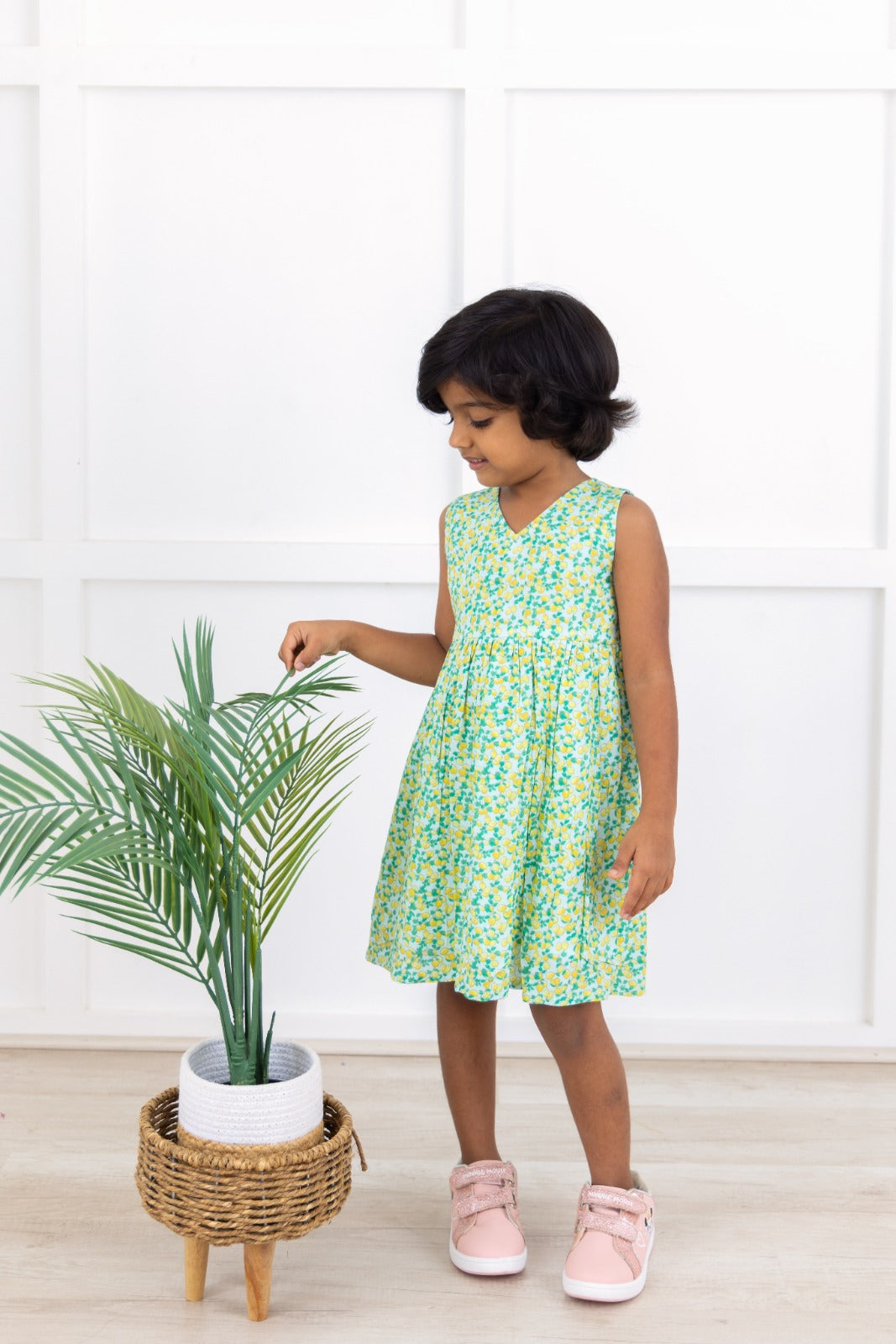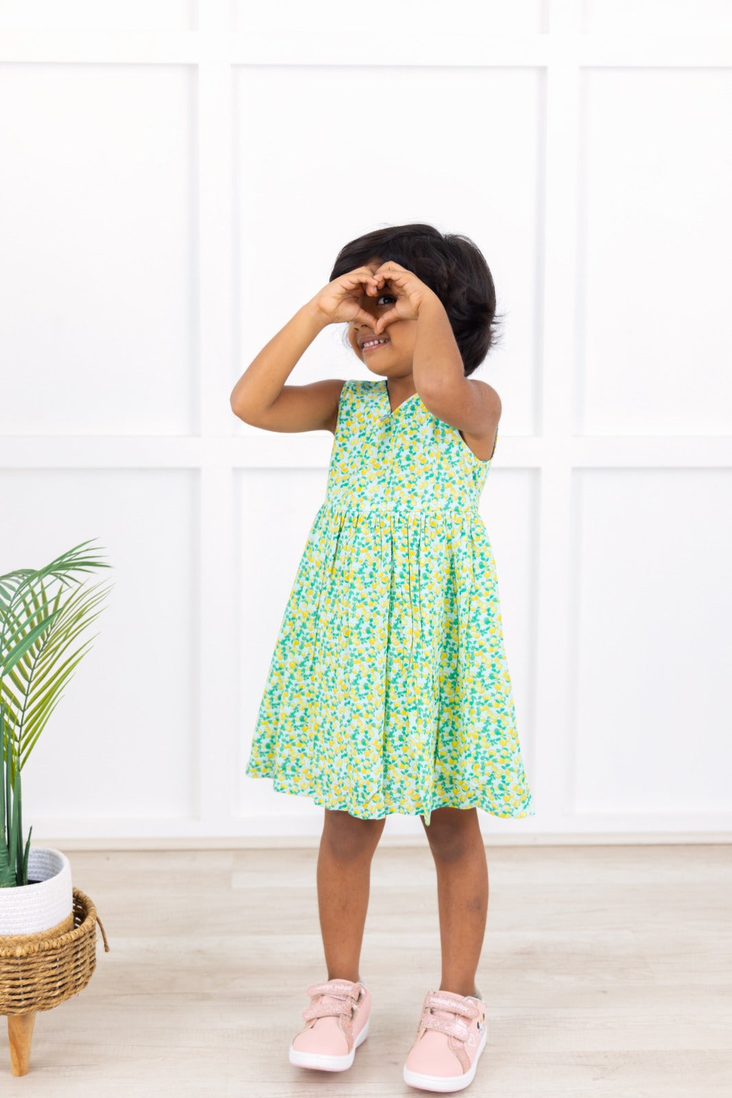 A cheerful sleeveless frock that captures the beauty of a blooming garden. Adorned with tiny yellow and blue floral prints on a refreshing green base, it radiates joy and charm. The V-neckline and gathered waist add a playful yet graceful touch, while the soft, breathable fabric ensures all-day comfort. Perfect for sunny outings, play dates, or simply twirling around in style. 🌸
