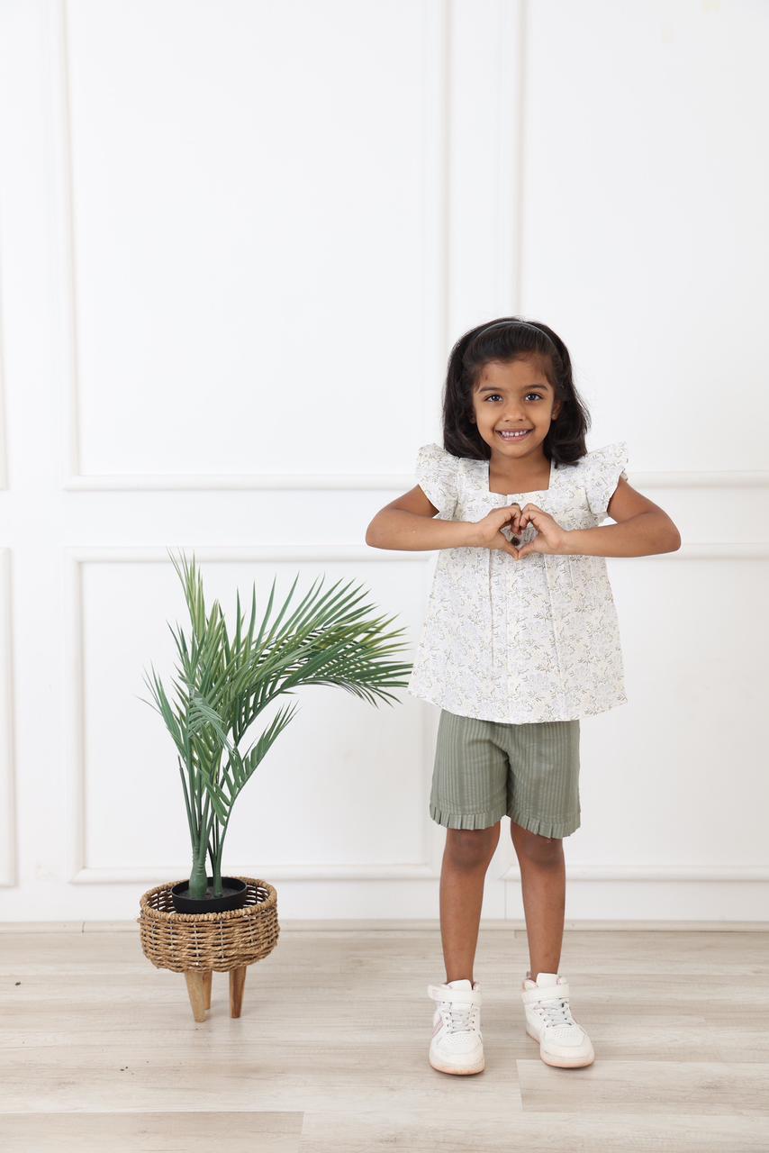 Little Olive Set is a breezy and beautiful co-ord designed for everyday comfort with a touch of vintage charm. The cream floral top features delicate puff sleeves and gentle gathers, giving it a sweet, airy silhouette. Paired with olive-green striped bottoms with an elasticated waistband and subtle frill detailing, this set is perfect for easy movement and all-day play. Crafted in breathable, skin-friendly fabric, it keeps little ones cool and comfy while looking effortlessly adorable. Ideal for playdates, outings, or relaxed festive moments, this set brings together nature-inspired hues and timeless style.