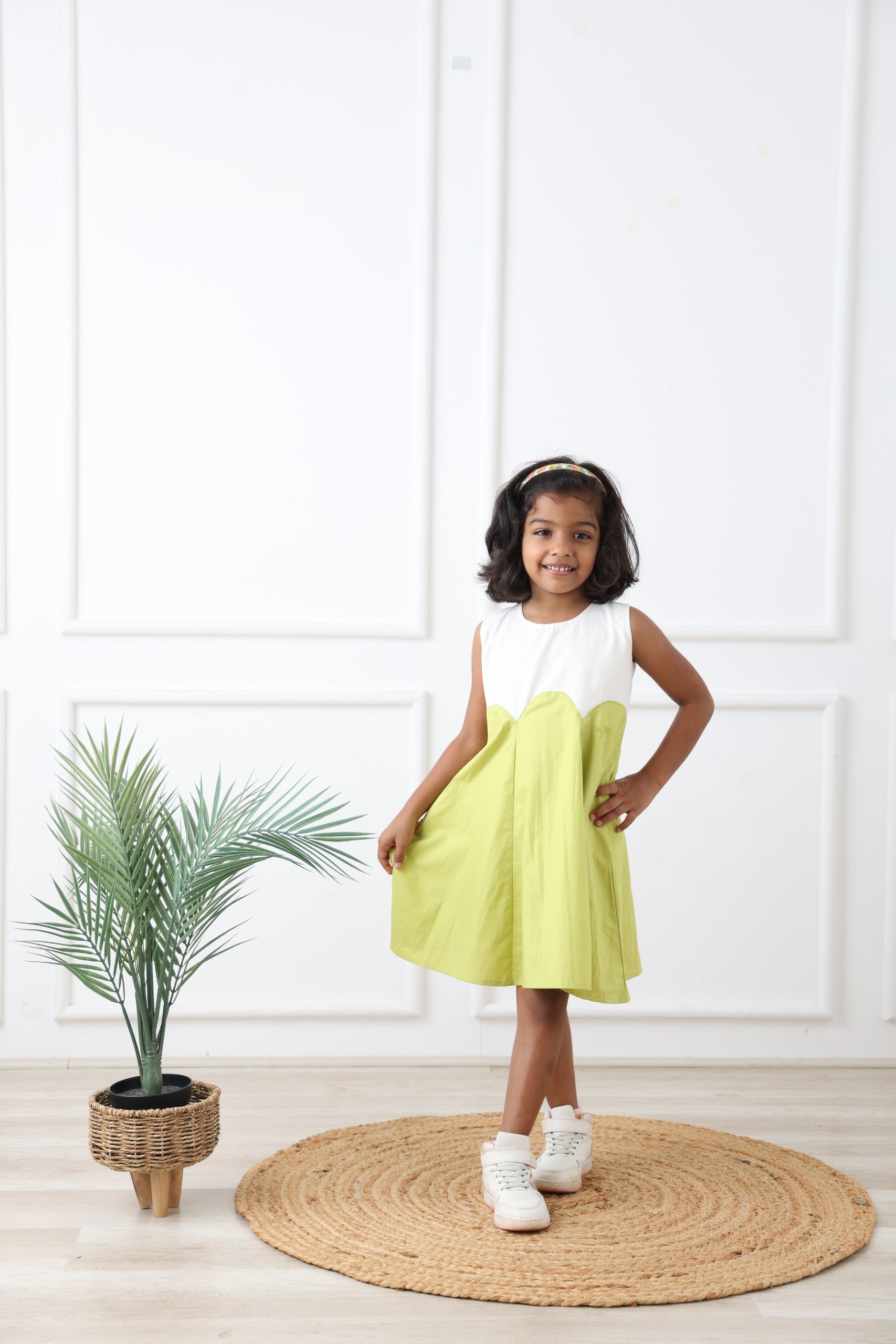 Fresh, playful, and full of sunshine vibes, the Spring Zest Frock is a perfect pick for bright little days. Featuring a soft ivory bodice paired with a lively lime green flare, this sleeveless beauty captures the essence of spring in every twirl. The gently scalloped waistline adds a sweet design touch, while the flowy skirt gives it that easy, breezy movement kids love.