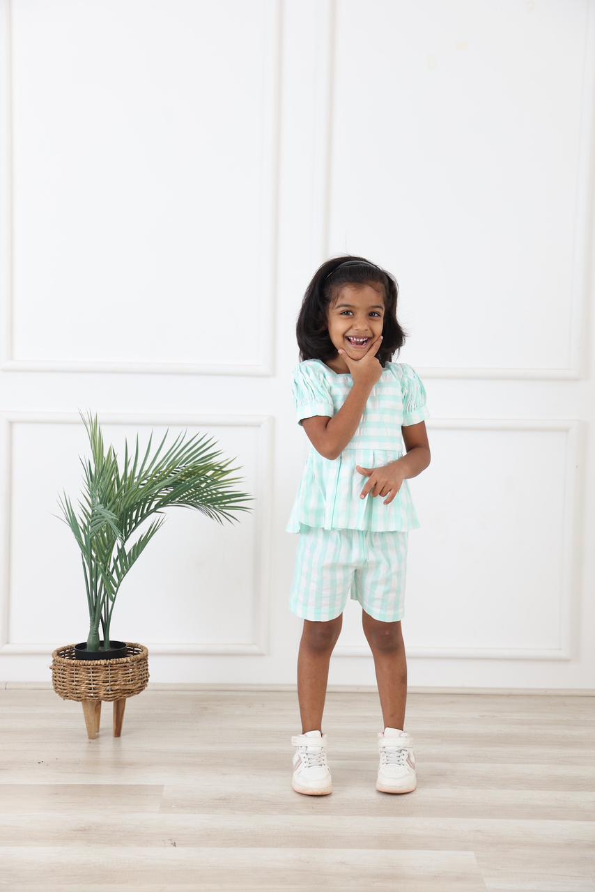 The Sugar Mint Co-ord Set is a refreshing blend of comfort and charm, designed to keep little ones feeling cool and stylish all day. Featuring soft mint and white stripes, the set comes with a puff-sleeve top detailed with a playful asymmetrical neckline and a gently gathered waist for an easy, breezy fit. Paired with matching bottoms, this co-ord offers effortless coordination with a touch of sweetness. Crafted from lightweight, breathable fabric, it’s perfect for sunny outings, playdates, and everyday wear, bringing a soft pastel glow to your child’s wardrobe.