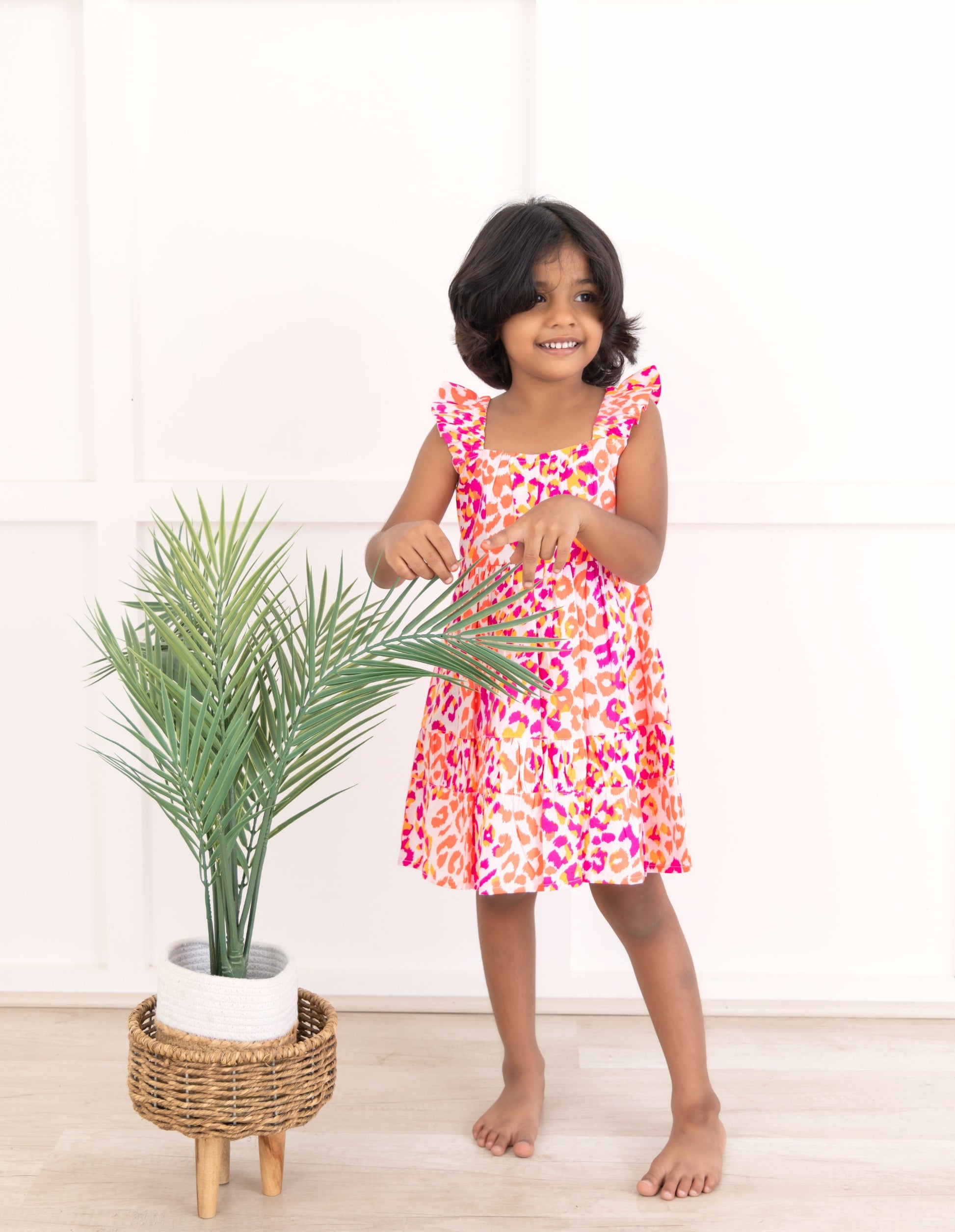 Unleash playful adventure with this **Wild Safari Frock**, featuring a vibrant animal-print design in pops of coral, orange, purple, and pink. Crafted from soft, breathable fabric, it comes with ruffled shoulder straps and a flared, tiered skirt that twirls with every step. Perfect for sunny outings and special occasions, this frock adds a burst of fun and color to your little one’s wardrobe.